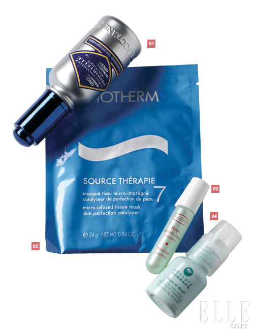 1 록시땅 베리 프레셔스 리제너레이팅 컨센트레이트. 9만원. 2 비오템 수르스테라피 7 마스크. 7만7천원. 3 클라란스 블레미쉬 컨트롤. 2개, 3만원. 4 오리진스 피스 오브 마인드. 1만8천원.
