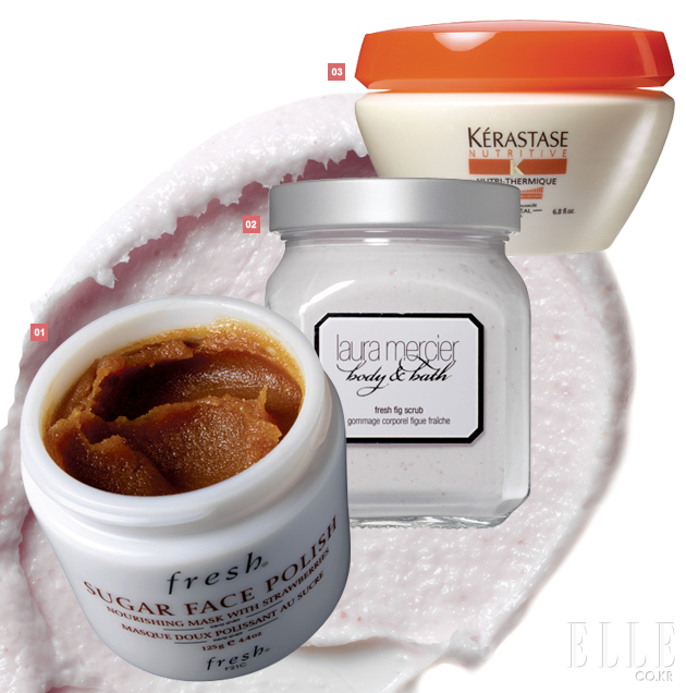 1 프레쉬 슈가 페이스 폴리쉬. 10만2천원. 2 로라 메르시에 프레쉬 피그 스크럽. 6만5천원. 3 케라스타즈 뉴트리 테르미크 헤어 마스크. 6만9천원.