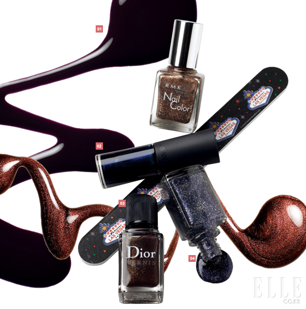 네일 숍에서 컬러링을 받는 것이 가장 좋겠지만 그럴 시간이 없다면 파일을 이용해 손톱 길이와 모양을 일정하게 맞춰줄 것. 길이가 제각각이거나 손톱이 부러져 있으면 지저분해 보이지만 길이만 맞춰도 충분히 관리받은 느낌을 줄 수 있다. 컬러를 바르기 전 리치한 핸드 크림을 발라 촉촉하게 해주는 것은 필수. 파티에는 역시 네이비, 다크 브라운, 와인처럼 어두운 계열이 잘 어울린다. 혹은 골드나 실버처럼 클래식한 메탈 컬러들을 발라주면 글래머러스한 분위기를 연출할 수 있으니 참고할 것. 피그먼트가 큼직한 것을 골라 포인트를 주는 것도 좋은데 한두 번 얇게 바른 다음 톱 코트를 바르면 블링블링한 파티 네일을 완성할 수 있다. |
