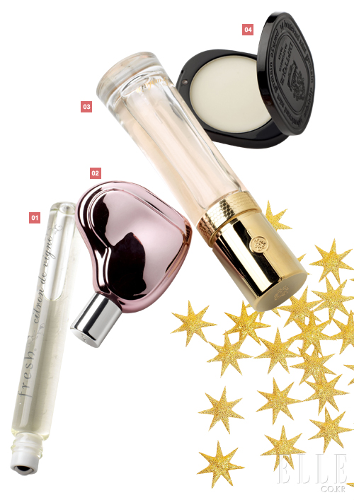 1 프레쉬 슈거 리치 롤러볼 오드 퍼퓸. 3만5천원. 2 비비쉬어.가격미정. 3 겔랑 이딜 오드 퍼퓸 미니어처. 가격미정. 4 딥티크 오듀엘르 솔리드 퍼퓸. 7만8천원.