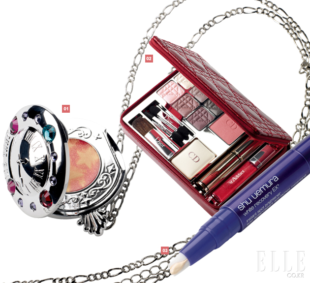 1 안나수이 네크리스 루즈, 5만9천원 2 디올 멀티 유즈 팔레트. 9만원. 3 슈에무라 인스턴트 스팟 브라이트너. 5만8천원.
