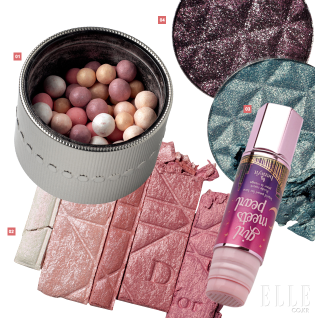 1 겔랑 메테오리트 펄 도르 일루미네이팅 파우더. 7만4천원. 2 디올 디올 스킨 쉬머 파우더. 5만7천원. 3 베네피트 걸 미츠 펄. 4만5천원. 4 에뛰드 아이 시크릿. 4천5백원. |