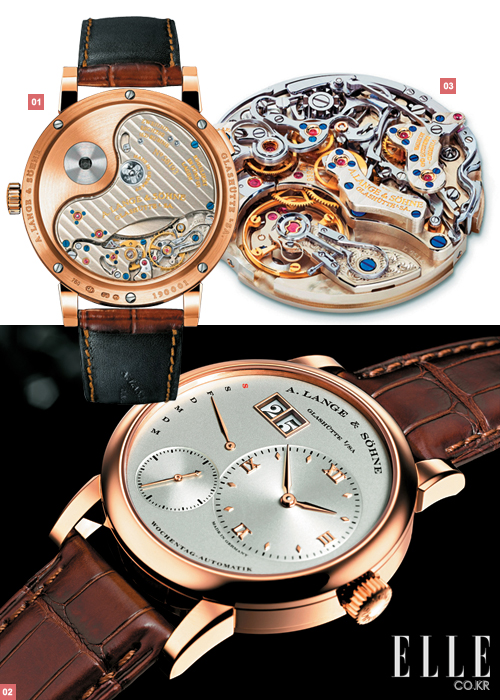 A. LANGE & SOHNE 1 랑게 31의 뒷모습. 2 랑게 1 데이메틱. 3 투르보그라프의 무브먼트.