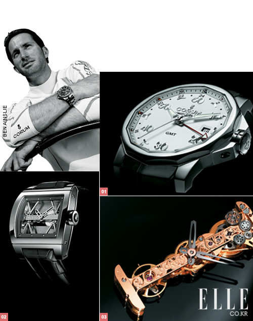 CORUM 1 애드미럴스 컵 GMT 44. 2 티 브리지. 3 골든 브리지 무브먼트.