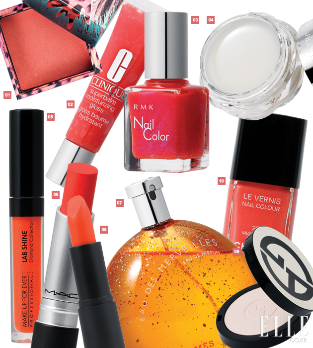 1 베네피트 코랄리스타 42,000원 피부톤을 살려주는 산호빛 블러셔, 12g. 2 크리니크 슈퍼밤 글로스 25,000원 자연스럽게 틴티드된 앵두빛 입술 연출, 15ml. 3 RMK 네일 컬러 N 27,000원 크리스털 같은 광택, 12ml. 4 질 스튜어트 프루트 립밤 N 23,000원 입술의 각질과 잔주름 완화, 7g. 5 메이크업 포에버 랩 샤인 30,000원 메탈릭한 반짝임을 주는 선명한 다홍빛, 2.6g. 6 맥 프로 롱웨어 립크림 27,000원 번짐 방지 기능 필름막이 컬러를 생생하게 유지, 3.6g. 7 에르메스 오드 메이베르 166,000원 시트러스와 우디-앰버 노트의 유니크한 조화, 100ml. 8 조르지오 아르마니 샤인 립스틱 36,000원 도쿄 코럴 컬러, 입술 본연의 색에 자연스럽게 어우러짐, 4g. 9 조르지오 아르마니 플래티넘 팔레트 58,000원 고급스러운 하이라이팅 효과를 주는 베이지 톤 시머 파우더, 7.2g. 10 샤넬 르 베르니 29,000원 마이애미 피치 컬러, 컬러와 반짝임이 오랫동안 지속, 13ml.