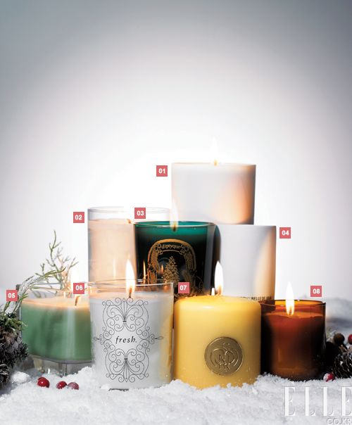 1 나스 보스포러스 캔들 68,000원 로맨틱한 무드를 조성해주는 은은한 플로럴 향취, 파라핀 무첨가. 2 아베다 샴퓨어 소이 왁스 캔들 40,000원 25가지 꽃과 식물 에센스가 마음을 차분하게 함. 3 딥티크 파인 캔들 125,000원 연말 축제 분위기 속의 종이인형극에서 영감받음, 톡 쏘는 솔잎 향취. 4 겐조 벨르 드 주르 캔들 가격 미정 심신을 안정시키는 파우더리한 화이트 로터스 향취. 5 록시땅 스위트 아몬드 캔들 35,000원 달콤한 설탕을 입힌 아몬드 과자 향기, 크리스마스 리미티드 에디션. 6 프레쉬 사케 캔들 83,000원 피치와 만다린의 과일 향으로 시작해 은은한 플로럴 잔향이 퍼지는 캔들. 7 산타마리아 노벨라 릴랙스 캔들 88,000원 계피와 오렌지, 라벤더 오일이 스트레스 완화. 8 아베다 홀리데이 캔들 그라운딩 리추얼 30,000원 스파이시하면서도 달콤한 향취, 100% 천연 성분 함유.