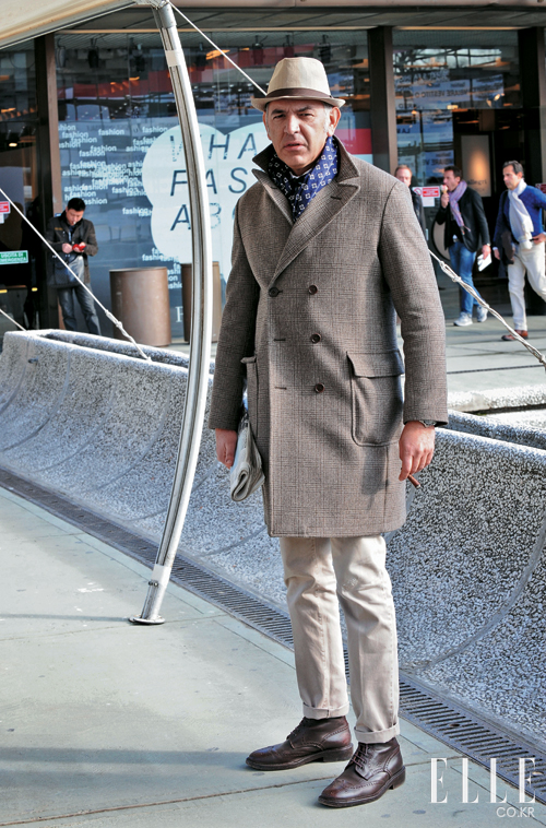 더블 브레스티드 코트는 약간 흐트러져야 더 멋지다. 수트 위에 더블 브레스티드 코트를 입고 단추를 다 채운 것만큼 답답하고 심심해 보이는 것도 없다. 단추는 여섯 개 중 하나만 채우고, 주머니에 손을 푹 찔러 넣기도 하고, 포멀한 팬츠 대신 치노 팬츠를 돌돌 말아 입기도 해야 한다는 얘기다. 이렇게 ‘드레스 다운’한 더블 브레스티드 코트 룩을 연출할 때 가장 도움이 되는 건 패턴 스카프다. 두껍고 무거운 니트 머플러 말고 가볍게 두르기 좋은 것. 사진 속 신사처럼 코트 깃을 세우고 목에 살짝 감기만 해도 한층 산뜻한 룩을 완성할 수 있으니까. 밋밋한 것보단 컬러감이 있거나 작은 패턴이 있는 스카프를 추천한다. |