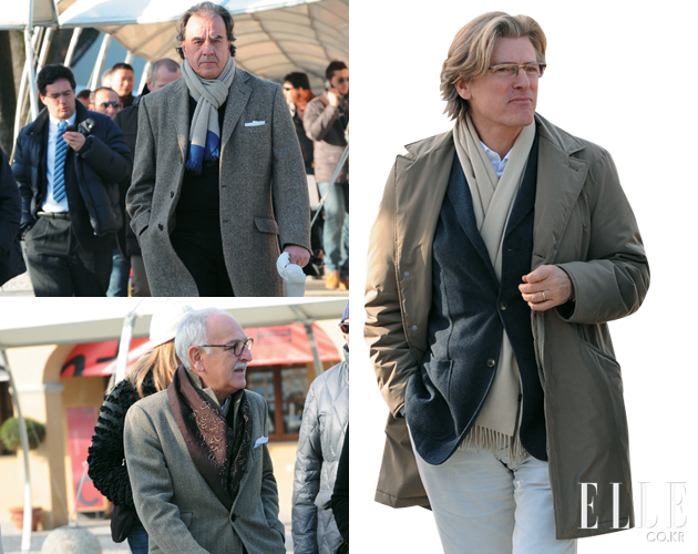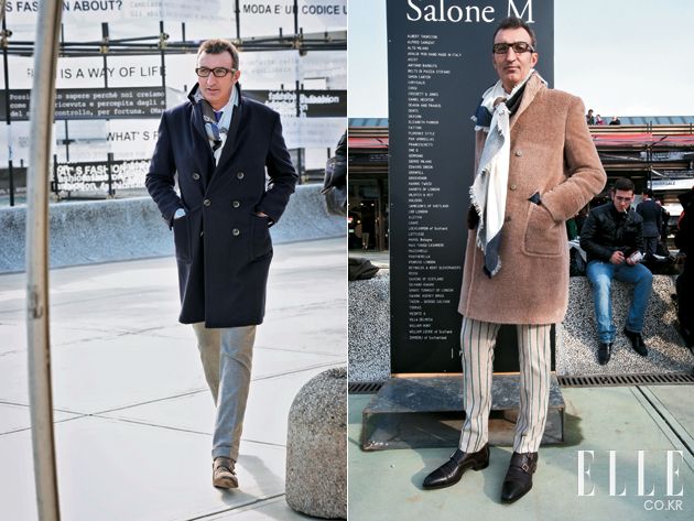 | 더블 브레스티드 코트와 스카프의 이상적인 조합. 넓고 긴 스카프를 자유자재로 활용한 이 신사의 두 가지 룩을 눈여겨보길. 중요한 건 스카프를 최대한 자연스럽게 연출해야 한다는 것. |