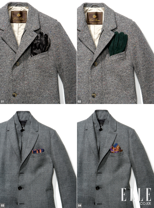 4 울 소재 포켓 스퀘어를 볼륨감 있게 꽂으면 한층 우아하다. 그레이 코트 2백58만원 닐 바렛 포켓 스퀘어 15만원 드레이크스 by 란스미어