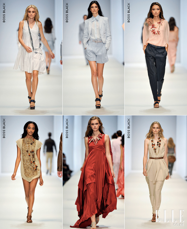 케빈 로보가 이끄는 남성복과 함께 진행하는 보스 블랙 컬렉션에선 훤칠한 남성 모델들이 선보이는 의상을 보는 재미도 쏠쏠하다. 보스의 도시 남자는 지구,물,공기,불을 모티프로 불루,핑크 등 밝고 신선한 컬러의 수트와 살짝 긴장을 푼 듯한 셔츠,쇼츠 룩을 선보여 입가에 훈훈한 미소를 자아냈다.