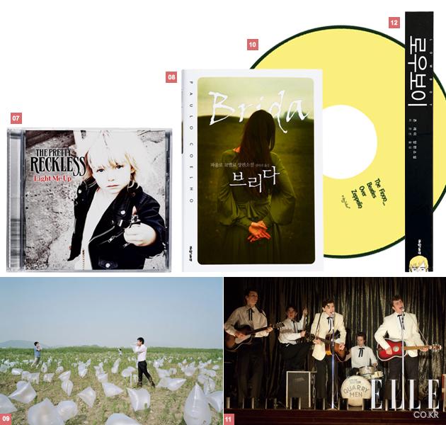 7 더 프리티 레크리스의 ‘가십걸’의 테일러 맘슨이 보컬로 있는 록 밴드, 더 프리티 레크리스(The Pretty Reckless). 그 첫 번째 정규 앨범이다. 18세 소녀가 부르는 축축하고 헤비한 그런지 록 그리고 무척이나 섹시한 앨범 북클릿. 재능 넘치는 소녀를 만나는 건 언제나 즐겁다. 8 브리다 ‘한 권의 책이 가장 많은 언어로 번역된 작가’로 기네스북에 등재된 작가, 전 세계 1억1500만 부가 넘는 판매를 기록한 작가…. 모두 파울로 코엘료를 두고 하는 말이다. <브리다>는 <연금술사> 발표 후 작가가 순례 중에 만난 한 여인이 모티브가 됐다. 스무 살 여자 브리다, 그녀의 눈부신 자아 발견의 여정을 그린 이야기. 9 FF ‘Fast Forward’라는 뜻의 ‘FF’ 전. 학생 신분에서 벗어나 처음으로 독립적인 걸음을 내딛는 젊은 사진작가 박형렬, 양승원, 윤선영, 이일석의 그룹 전시다. 현시대를 바라보는 각각의 참신한 시선이 담긴 작품 20여 점을 선보인다. 12월 5일까지 마이크 슐츠 갤러리. 10 더 핀의 지산 밸리 록 페스티벌에서 몇 곡의 데모를 부른 것 외에는 프로필이 없는 신인. 이른바 ‘갑툭튀’인 두 남자의 첫 번째 앨범. 대중음악평론가인 김작가는 이들을 두고 언니네 이발관과 검정치마의 데뷔 앨범 같다고 평하였다. 타이틀곡 ‘공개무시금지’를 비롯해 젊음으로 꽉 찬 앨범. 11 노웨어보이 비틀스의 리더 존 레넌은 어떻게 음악과 조우했을까. 리버풀의 촌뜨기 소년이 세계적인 음악 아이콘으로 성장해가는 모습을 담은 영화. 할리우드 라이징 스타 애런 존슨이 존 레넌을, <러브 액츄얼리>의 토머스 생스터가 폴 매카트니 역을 맡았다. 존 레넌 사망 30주기인 12월 8일, 그 다음 날인 9일에 개봉한다. 12 로우보이 2007년 문학잡지 <그랜타> 선정 ‘미국 최고의 젊은 소설가’ 중 한 명인 존 레이의 세 번째 장편소설. 작품의 배경이 되는 곳에 살다시피 하며 철저하게 몰입하기로 유명한 그는 이 책 역시 지하철을 타고 하루 종일 뉴욕을 돌며 노트북으로 집필했다. 외로운 아웃사이더 주인공을 통해 현대의 어두운 단면을 시종일관 섬뜩하면서도 사실적으로 그려낸 작품.