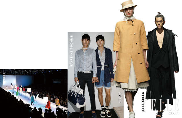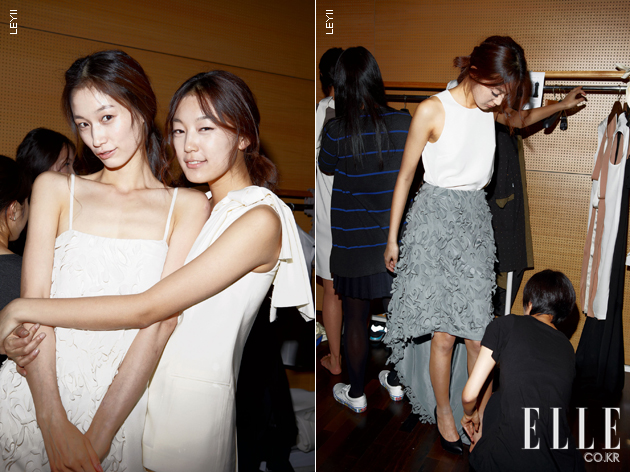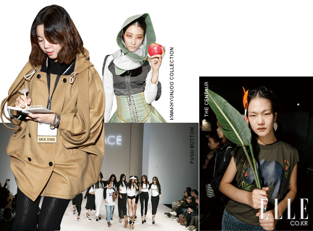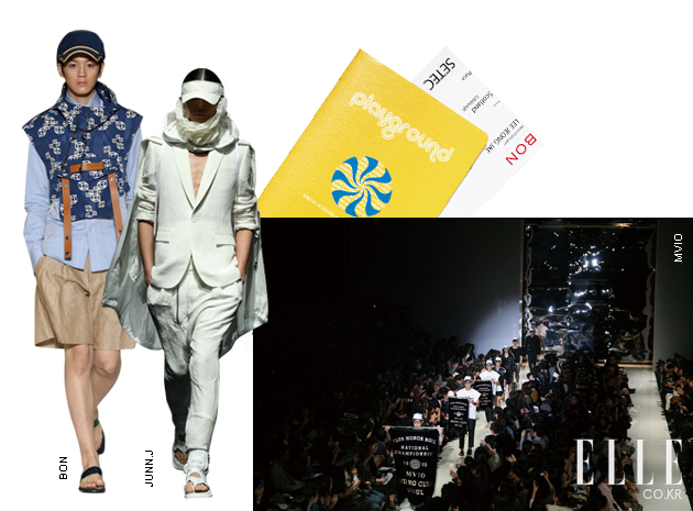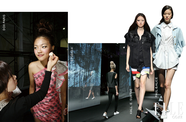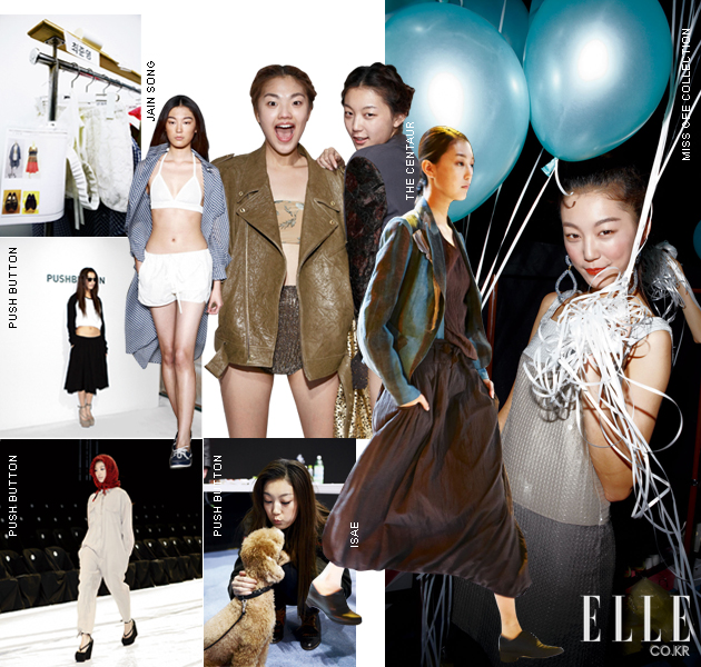 Miss Gee Collection 케이크같이 쌓아 올린 머리, 반짝이는 입술의 메이크업은 내가 입은 반짝이는 비즈 장식 미니드레스와 무척 어울렸다. 톱포즈 연습으로 백스테이지는 그 어느 때보다 분주했고, 풍선을 한가득 들고 나간 피날레가 기억에 남는다. jain song 그을린 피부와 검은 눈썹을 지닌 바닷가의 소녀들을 컬렉션에 세운 제인 송. 그래서인지 플리플롭을 신고 모래사장을 걷는 듯 캣워크를 걸었다. 리조트 웨어 느낌의 컬렉션 중 가장 기억에 남는 건 깅엄 체크 패턴의 가벼운 아우터다. 마치 턱시도처럼 뒷단을 길게 뺀 재킷 디자인이 독특했으며, 더불어 스윔수트와 멘즈 웨어를 처음으로 선보인 자리이기도 했다. PUSH BUTTON 마스코트인 푸시와 버튼이가 나타나자 백스테이지는 난리도 아니었다. 내가 입었던 스킨 컬러 점프수트에 매치한 체크 스카프는 스커트로, 미니드레스로 변형됐고, 피날레는 블랙 & 화이트 룩을 입은 모델들이 신나게 걸어 나오는 것으로 마무리됐다. 플리플롭을 변형한 스트랩 웨지힐은 보는 것보다 실제 착용하면 엄청 편하다는 사실! THE CENTAUR 소녀 둘이 등장한 센토르의 오프닝 영상은 야릇한 레즈비언 코드가 있었지만 부서질 듯 환한 빛과 소녀들의 웃음 덕분에 마냥 심각하지만은 않았다. 빈티지와 밀리터리, 플라워와 매니시한 테일러링 등이 믹스되어 웨어러블하지만 센토르의 색이 잘 살아 있는 컬렉션이었다. isae 친환경 디자인이라는 수식어답게 마치 한지 같은 느낌의 옷은 루스하고 내추럴한 피트가 특징적이었다.