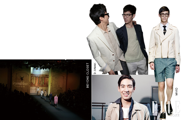 MIN HO'S D.GNAK 더블 커프스나 더블 칼라 등 숨어 있는 디테일에 재미있는 요소가 많았다. 부스스한 머리로 캣워크를 걸으며 워커홀릭으로 변신한 이번 시즌 첫 번째 쇼. beyond closet ‘your boyhood’라는 과거로 향하는 타임머신을 탄 비욘드 클로짓. 쇼 내내 흐르던 타히티80 음악만큼 밝은 웃음이 절로 나오는 긍정의 유년 시절로 가득했다. 특히 피날레에 입었던 로즈 핑크 점퍼는 여자들마저도 열광했던 잇 아이템. MVIO 다가오는 봄, 남자들은 엠비오의 제안처럼 투박한 벨트 대신 고운 스카프를 허리춤에 두를지도 모른다. 컬렉션 전반 내내 흘렀던 윤상의 다독임처럼 ‘그럴 수도 있겠지’라고 생각해본다. |