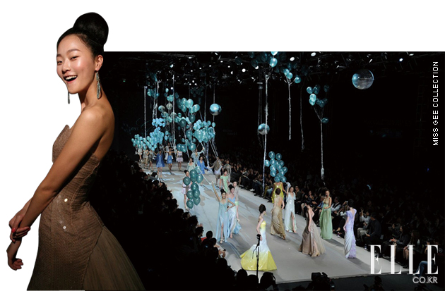 Miss Gee Collection 백스테이지의 환호성이 울려 퍼지자 대망의 피날레 쇼가 시작됐다. 플레어스커트 수트와 매니시 팬츠 등 시그너처 스타일에 해바라기, 나뭇잎 등 내추럴한 오브제가 첨가됐고, 신나고 경쾌한 캣워크는 이브닝드레스와 캣워크를 가득 메운 풍선의 등장으로 막을 내렸다. |