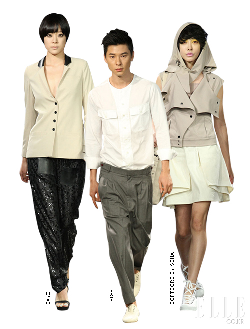 S=YZ 블랙, 스킨 컬러를 베이스로 한 안정적인 컬러 팔레트 덕분에 이질적인 소재의 조합은 고급스럽게 표현됐으며, 신선한 스타일링과 미니멀한 라인으로 s=yz의 감성을 드러냈다. leigh 1920년대 독일 라이프스타일 매거진에서 영감을 얻은 레이는 포켓 디테일 셔츠로 밀리터리 테마를 표현했으며, 여기에 레이의 시그너처인 루스 피트 팬츠나 버뮤다 팬츠 등을 매치해 레이만의 터치를 더했다. Softcore by Sena 오로지 전진만 있는 캣워크에 의문을 가진 윤세나는 ‘몇 발자국 뒤로 걷기’라는 사소한 발상의 전환으로 임팩트 있는 무대연출을 시도했다. 특유의 스포티한 감성을 절제된 컬러 팔레트로 웨어러블하게 제안해 지난 시즌에 비해 한결 다듬어진 아이디어를 선보였다. |