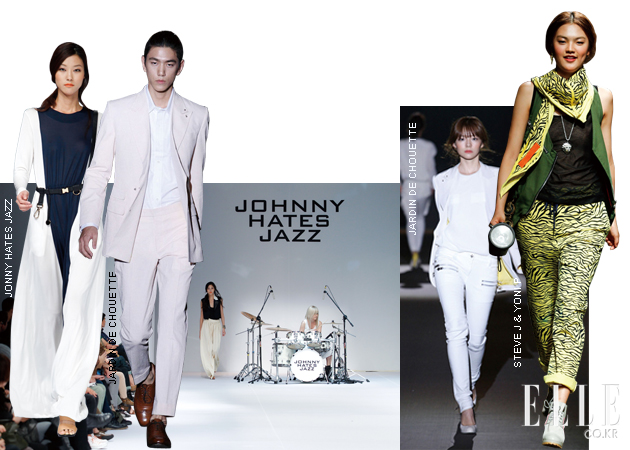 jardin de chouette 별 귀고리와 별 브로치 등 포인트 액세서리와 보 장식, 레몬 컬러 포인트 등이 가미되 복고 무드를 선보인 쟈뎅 드 슈에뜨. 나는 매니시한 와이드 팬츠 수트와 별 프린트 스커트 등 총 세 벌의 옷을 입었다. 그중 올 화이트의 르 스모킹 수트는 매니시 룩을 좋아하는 내가 쟈뎅 드 슈에뜨 컬렉션에서 가장 마음에 들었던 룩. Johnny hates jazz 평소에도 너무나 좋아하는 쟈니 헤잇 재즈의 컬렉션이 드디어 제너레이션 넥스트를 떠나 서울 컬렉션으로 들어왔다. 은발의 드러머가 라이브 드럼 연주를 시작하자 세련된 캣워크의 막이올랐다. 철사 꼬임 같은 스트라이프 패턴은 보기만 해도 여름을 떠올릴 만큼 시원했고, 캔버스 소재의 형광 벨트는 어떤 룩에 매치해도 포인트 액세서리로 손색없을 듯! |