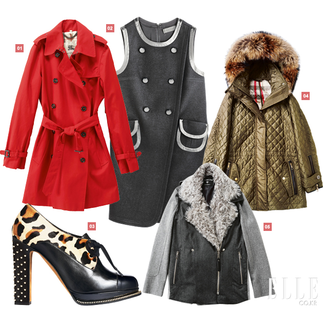 1 레드 트렌치코트. 2백만원대. 버버리 런던. 2 포켓 디테일의 그레이 원피스. 가격 미정. 질 스튜어트. 3 스터드 디테일의 레오퍼드 슈즈. 굽 11.5cm. 86만원. 모스키노 칩 앤 시크. 4 퍼 후드가 달린 카키 야상. 2백만원대. 버버리 브릿. 5 베스트와 코트 두 가지로 입을 수 있는 에비에이터 재킷. 40만원대. 커밍 스텝.