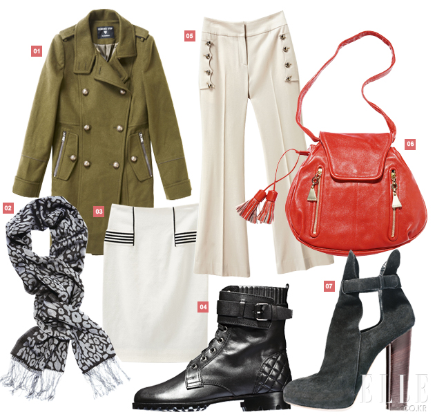 1 밀리터리 카키 코트. 52만9천원. 커밍 스텝. 2 그레이 레오퍼드 스카프. 가격 미정. 마리아 꾸르끼. 3 H 라인의 화이트 스커트. 86만원. 모스키노. 4 버클 디테일의 워커. 38만5천원. SJSJ. 5 와이드 부츠컷 팬츠. 가격 미정. 쟈뎅 드 슈에뜨. 6 레더 스트랩 체리 백. 35×32cm. 가격 미정. 씨 by 클로에. 7 블랙 스웨이드 플랫폼 힐. 굽 13.5cm. 가격 미정. 셀린. |