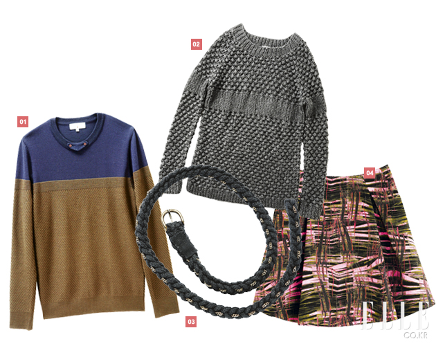 1 박시한 실루엣의 네이비&브라운 니트. 17만8천원. 커스텀 멜로우. 2 루스한 그레이 니트. 30만원대. 커밍 스텝. 3 밧줄 모양의 블랙 벨트. 20만원대. 이로 by 셀레브레이션. 4 이국적 패턴의 핑크 스커트. 42만5천원. 마인. |