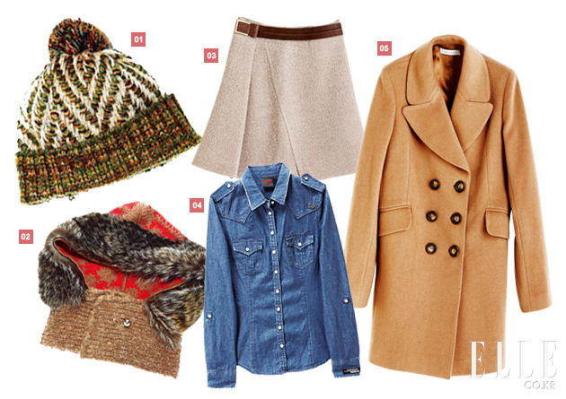 1 폼폼 디테일 니트 모자. 28만원. 미소니. 2 퍼 트리밍 니트 후드 스누드. 3백97만원. 미소니. 3 벨트가 달린 피치 울 스커트. 44만5천원. 마인. 4 캐주얼 무드의 데님 셔츠. 9만9천원. 버커루 진. 5 더블 버튼 캐멀 코트. 89만8천원. 산드로. |