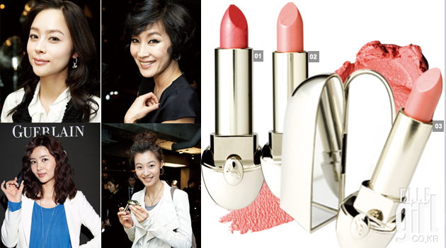 GUERLAIN 겔랑 ‘루즈G’의 마니아 스타는 우희진, 이혜영, 박솔미, 윤소이. “전 립스틱을 고를 때 색감에만 의존하지 않고 촉촉한 텍스처까지 생각해요. 하지만 너무 글로시하면 립 라인 밖으로 번지기 쉬우므로 적당한 제품을 고르는 게 중요하죠. 바로 겔랑의 루즈G처럼 말예요.” 관록있는 여배우 이혜영의 립스틱 고르는 노하우는 전문가의 수준을 넘어선다. 텍스처 다음으로 중요한 요소는 피부톤에 맞는 컬러를 선택하는 것. 겔랑 메이크업 프로모션팀 조승준 팀장의 조언에 따르면 노란 피부에는 선명하고 밝은 산호빛의 00호, 어두운 피부에는 둔탁한 느낌의 22호, 붉은 피부는 은은한 60호, 흰 피부에는 선명한 21호가 잘 어울린다고 한다.