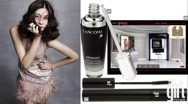 1 업계 최초로 피부 유전자의 바코드를 해석, 피부에 화사함과 탄력을 부여하는 유전자 에센스, 제니피끄. 50ml. 15만원. 2 랑콤의 광고 비주얼이 걸려있는 매장 전경을 그대로 재현한 ‘엣진’ 브랜드 페이지. 3 뭉침없이 드라마틱한 속눈썹을 연출해주는 제품으로 배우 차예련이 즐겨쓰는 마스카라, 오실라씨옹. 8g. 4만7천원.