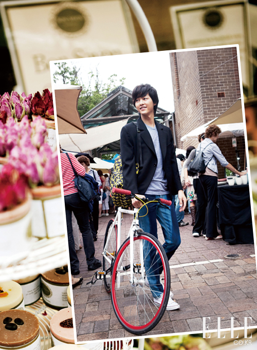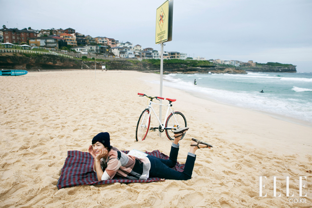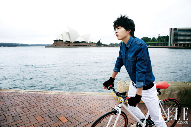 | 오페라 하우스가 시원스레 한눈에 잡히는 서큘라 퀴 (Circular Qauy)에서 송중기가 입은 데님 셔츠는 1백만원대, Burberry Prorsum. 화이트 데님 팬츠는 본인 소장품. 버클 벨트는 76만원, Louis Vuitton. 슈즈는 16만 8천원, Fred Perry. 핑거리스 글러브는 에디터 소장품. 화이트와 레드 컬러의 조화가 경쾌한 자전거는 62만원, Republic Bike by Mag N Mag. |
