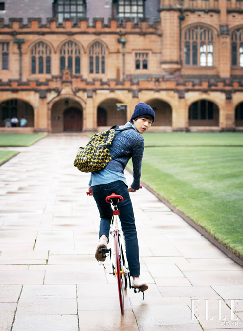 호그와트 성을 연상시키는 시드니 대학교에서 송중기가 입은 니트 풀오버와 기하학적 패턴의 백팩은 가격 미정, 모두 Prada. 데님 셔츠는 21만8천원, Armani Jeans. 니트 비니는 50만원대, Louis Vuitton. 데님 팬츠와 슈즈는 본인 소장품. 자전거는 62만원, Republic Bike by Mag N Mag.