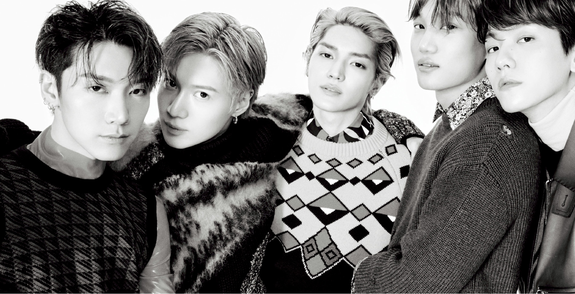 텐이 입은 니트 베스트와 라텍스 소재의 톱, 팬츠는 모두 Givenchy. 태민이 입은 터틀넥과 바이커 팬츠는 모두 Alexander McQueen. 태용이 입은 니트 톱과 셔츠, 팬츠는 모두 Prada. 카이가 입은 니트 톱과 플로럴 패턴의 셔츠는 모두 Gucci. 백현이 입은 레더 재킷과 터틀넥, 니트 톱은 모두 Berluti.