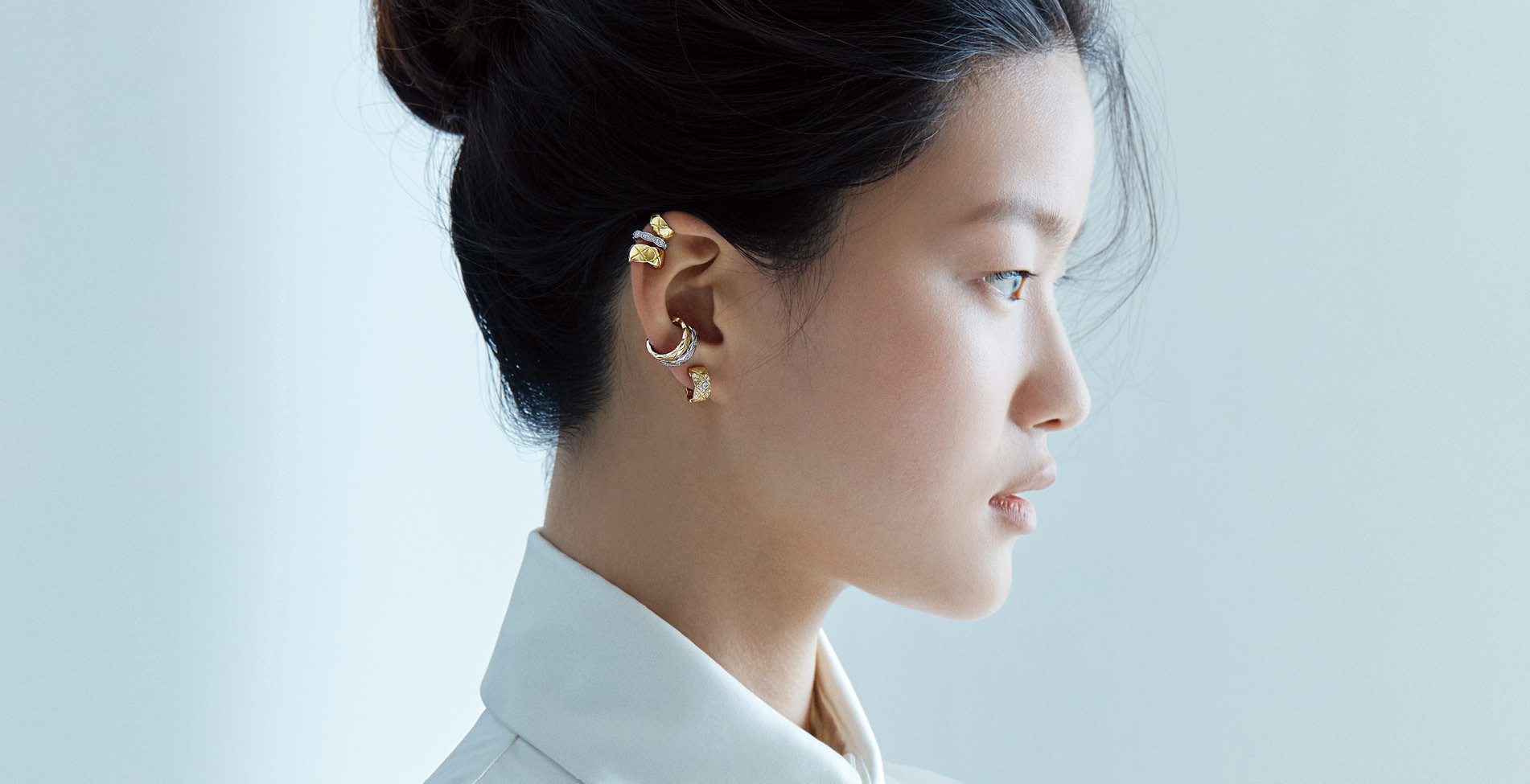 3개의 모티프가 레이어드된 이어 커프, 베이지골드와 화이트골드의 이어 커프, 다이아몬드를 세팅한 베이지골드 코코 크러쉬 이어링은 모두 Chanel Fine Jewelry.