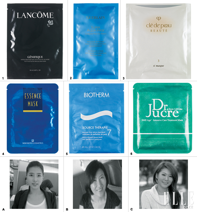 A ★★★★☆ 내용물이 흐르지 않은 쫀쫀한 젤 타입 시트 마스크라 사용하기 편하다. 1, 2번 에센스를 바르고 붙이니 흡수력이 배가돼 떼낸 후엔 얼굴에 윤기가 돌면서 건강해졌다. B ★★★★ 얼굴을 마구 움직여도 시트가 밀리지 않을 정도로 완벽하게 밀착된다. 안색도 맑아지고 붉은기도 없어졌으나 가격대가 조금 높은 것이 흠. C ★★★★ 떼어낸 후 내용물을 따로 흡수시키지 않아도 되고 쿨링 효과도 있지만 마스크를 붙이고 있을 때 공기가 통하지 않아 조금 답답할 수도 있다. 보습 효과는 무난한 수준.