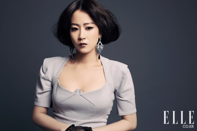 라이트 그레이 드레스는 RM by 디테일, 블랙 샹들리에 이어링은 금은보화. |