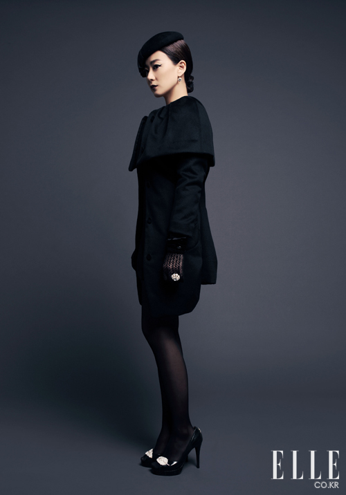 케이프 형태의 블랙 코트는 구호, 골드 이어링과 링은 케이트 스페이드, 하이힐은 왓아이원트, 빈티지 모자와 블랙 크로셰 장갑은 스타일리스트 소장품.