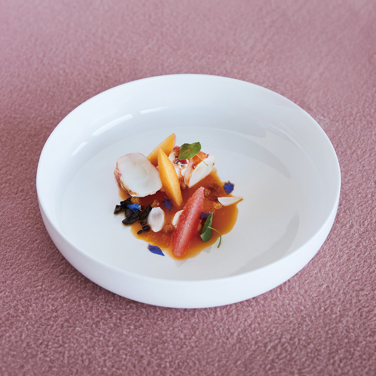 가르니튀르(가니시) 재료 살구 또는 망고 퓌레 150g, 복숭아 1개, 미니 양파 2개, 블랙 올리브 3알, 보리지꽃·한련 잎 약간씩