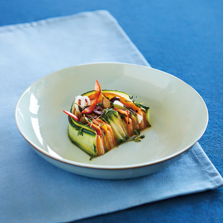 재료 늙은 호박·셀러리악 1개씩(500g씩), 당근·가지 1개씩, 타임 10g, 마늘 4쪽, 물 150ml, 올리브오일 50ml, 소금·플뢰르 드 셀(천일염) ·후추 약간씩 프렌치 리비에라 야채 타르트