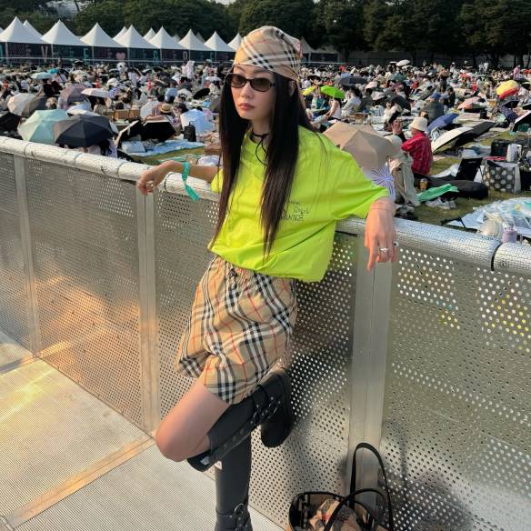 볼드한 스트라이프와 투 톤 백을 활용한 유니크한 스타일이 개성 넘친다.