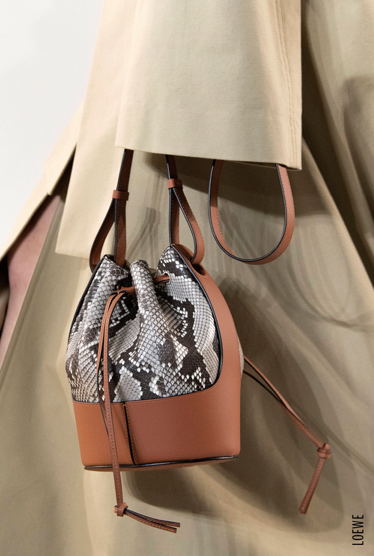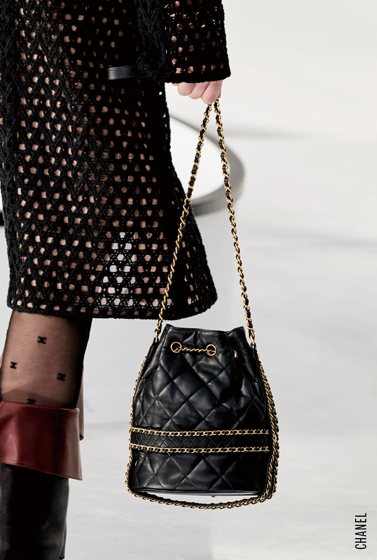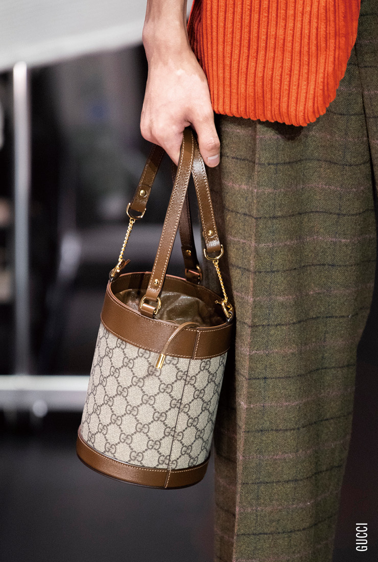 90년대를 향한 향수는 버킷 백의 귀환이라는 커다란 물결을 몰고 왔다. 지난 시즌 유행한 플라스틱 양동이를 닮은, 알록달록하고 위트 있는 디자인은 사라지고 그 시절 여대생들의 ‘잇’백처럼 아담하고 얌전한 복주머니 스타일로 변모했다. 블랙과 브라운, 베이지 같은 무난한 컬러와 브랜드 헤리티지를 담은 클래식한 패턴이 적용된 이번 시즌 버킷 백은 새로운 가방이지만 누구나 경험해 봤을 법한 친숙함이 특징이다.    Bucket Callenge