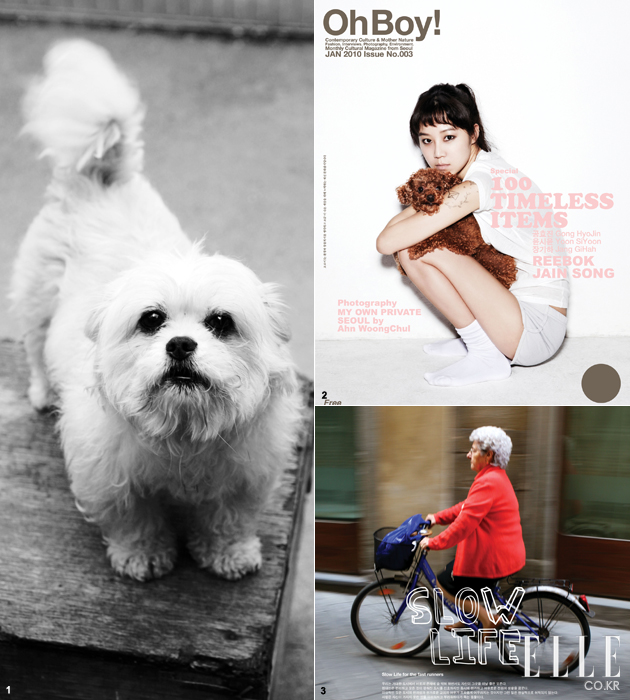 1 동물자유연대에서 만난 어느 유기견의 모습. 2 공효진이 표지 모델로 나선 <오보이!> 제3호. 3 ‘슬로 라이프’를 제안하는 <오보이!>의 기사