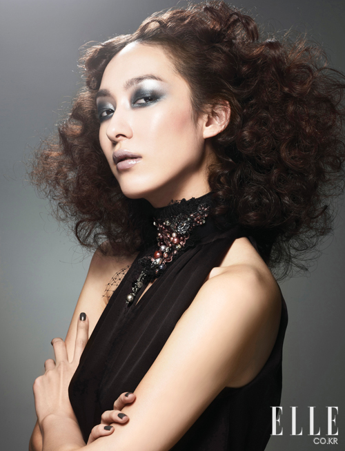 Sexy Mood of Devil 5 꿀뢰르 팔레트 034호 중 블랙 컬러를 아이 홀에 짙게 바르고 눈 앞머리와 아래쪽에 실버 컬러를 덧발라 하이라이트를 줬다. 그레이 컬러를 눈썹뼈 밑부분을 중심으로 넓게 발라주고 블랙 아이섀도를 한 번 더 쌍꺼풀 라인에 발라 깊은 눈매를 완성했다. 속눈썹을 잘 정리한 후 디올 쇼 마스카라 360을 속눈썹 뿌리부터 잘 발라줘 짙게 연출했다. 홀터넥 드레스는 Aigner, 큐빅 장식으로 된 초커 스타일의 밴드는 Bora Korea. |