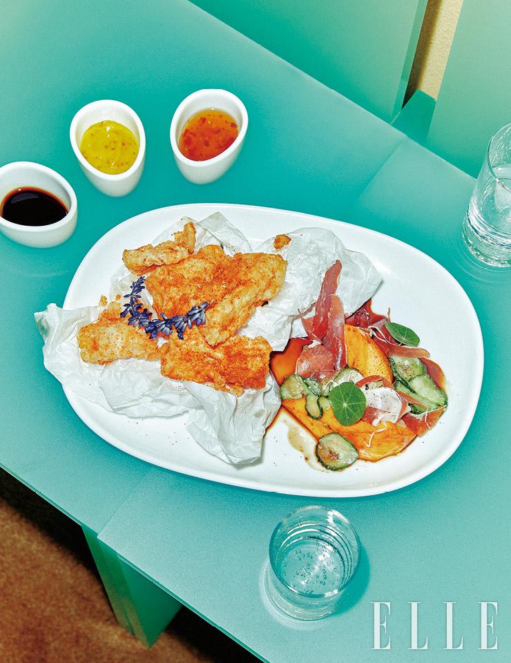 내가 생각하는 이상적인 플래터의 조건은 다음과 같다. 테이블에 둘러앉은 누구나 쉽게 즐길 수 있도록 호불호가 없어야 한다는 것. 튀김을 싫어하는 사람은 없으니 피시 앤 칩스를 메인으로 한 플래터를 구상했다. 단호박의 달콤함과 하몽의 짭짤함, 소금물에 살짝 절인 오이의 상쾌함이 조화를 이루는 단호박 오이 하몽 샐러드를 사이드 디시로 올려 튀김의 느끼함을 상쇄했다. 샐러드 드레싱은 마요네즈 베이스의 그리비체 소스를 썼는데 여의치 않으면 마요네즈와 레몬즙, 설탕, 다진 케이퍼를 넣어 뚝딱 만들어도 충분히 그럴듯하다. 페어링 와인으로는 산미가 있는 내추럴 와인 중에서도 탄산이 많은 이탈리아 화이트 펫낫 와인을 추천한다. 마음 맞는 친구들과 함께 영화를 보며 공들인 요리를 맛보는 아늑하고 평화로운 홈 파티를 꿈꾼다. 도믹스 김도연 대표의 피시 앤 칩스 플래터