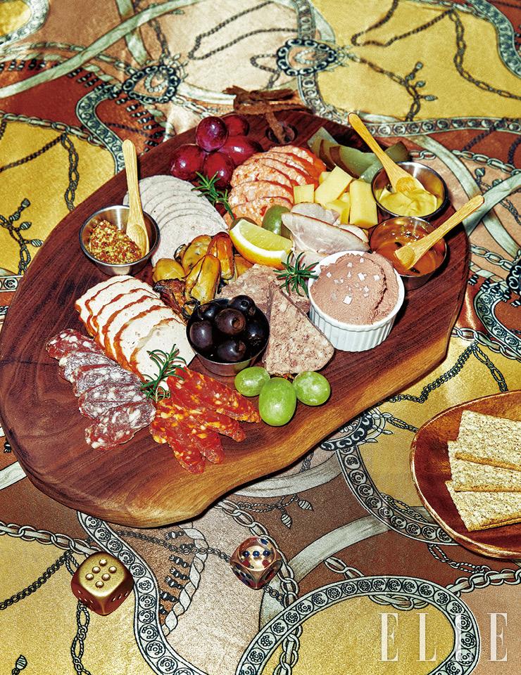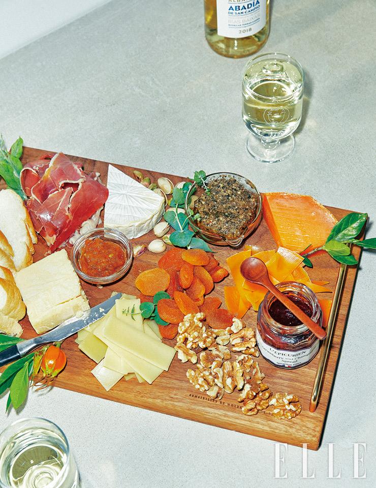 구하기 쉬운 식재료를 잔뜩 사서 멋스럽게 툭툭 올린 플래터를 만들었다. 단순해 보이지만 식재료 조합에 따라 탄생하는 맛과 향이 무궁무진한, 보면 볼수록 매력적인 플래터. 조리가 필요 없는 초간단 플래터지만 이국적이고 고급스러운 플레이버를 위해 잼과 페스토 만큼은 공을 들였다. 카망베르에 오렌지 잼을 찍어 먹으면 잼이 치즈 특유의 발효된 향을 살짝 눌러주면서 풍미를 끌어올리고, 슬라이스한 바게트 반미에 앤초비 페스토를 슥슥 발라 건살구를 올리면 ‘단짠’ 매력을 지닌 부르스게타가 완성된다. 여기에 와인이 빠질 수 없는 법! 개성이 그리 강하지 않은 치즈인 카망베르나 미몰레트에는 약한 산도와 부드러운 질감의 프로세코나 화이트 와인이 무난하게 어울리고 레드 와인을 곁들이고 싶다면 오크 향이나 타닌, 보디감이 약한 것으로 고를 것을 추천한다. 위키드와이프 홍선화 키친 캡틴의 치즈 플래터