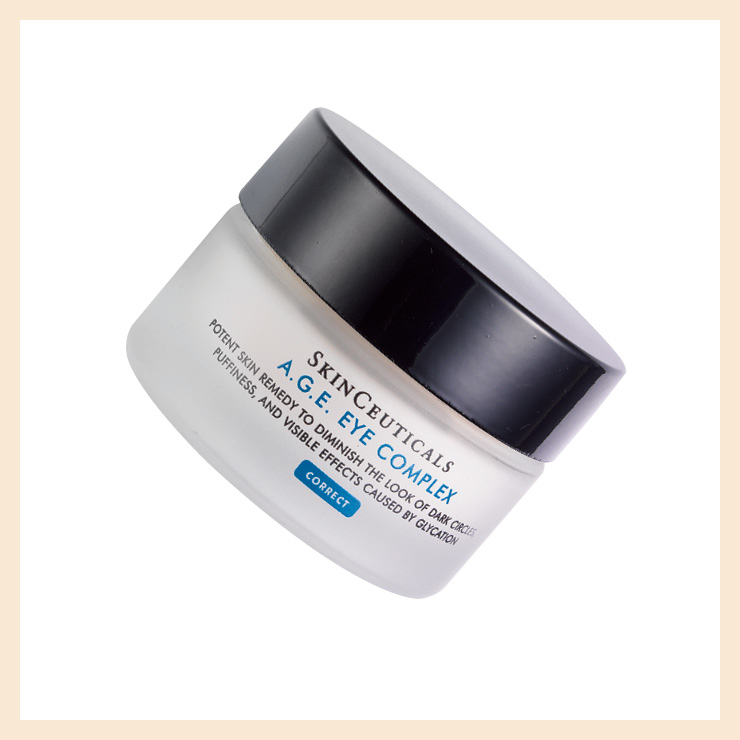 항산화에 탁월한 블루베리 추출 성분과 프록실린 펩타이드 등이 눈가에 탄력과 보습을 제공한다. 탁월한 발림성으로 화장하거나 몇 번 문질러도 밀리지 않는 부드러운 제형. A.G.E. 아이 콤플렉스, 13만5천원대, Skinceuticals.
