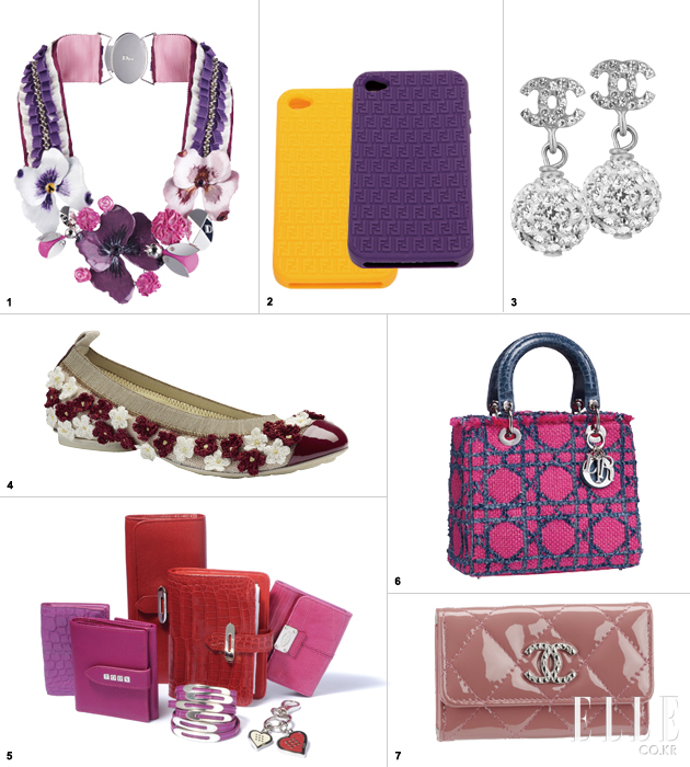 1 플라워 네크리스. 가격 미정. 디올. 2 컬러풀한 아이폰 케이스. 가격 미정. 펜디. 3 골드 메탈 이어링. 가격 미정. 샤넬. 4 베이지 캔버스 발레리나 슈즈. 가격 미정. 샤넬. 5 레드&핑크 밸런타인 셀렉션. 가격 미정. 토즈. 6 핫 핑크 캔버스 레이디 디올 백. 가격 미정. 디올. 7 핑크 페이턴트 카드 홀더. 가격 미정. 샤넬. |