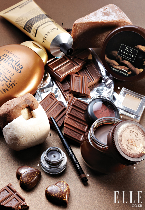 1 코코아 버터가 팔꿈치와 무릎의 건조한 부위를 촉촉하게 가꿔주는 레쥬비네이트 인텐시브 보디 밤. 120ml. 4만원. 에이솝. 2 커피 콩과 카카오 열매 오일이 건조한 모발에 부드러움을 선사하는 어웨이크닝 모카 에스프레소 샴푸. 384.5ml. 2만5천원. 오가닉스. 3 달콤한 코코아와 스위트 오렌지가 피로를 풀어주는 거품 목욕제. 마바. 100g. 9천4백원. 러쉬. 4 눈가 자극 없이 부드럽게 발리는 더블 웨어 스테이 인 플레이스 젤 아이라이너 02호. 3g. 3만원. 에스티 로더. 5 카카오 시드 버터 성분이 함유된 파워 프루프 라이너 2호. 0.2g. 5천원. 이니스프리. 6 벨기에산 카카오 매스가 함유된 고영양 마스크팩. 카카오에 함유된 다량의 폴리페놀 성분이 노화를 막아 피부를 탱탱하게 가꿔주는 초콜릿 마스크. 100g. 9천9백원. 스킨푸드. 7 딥 브론즈 컬러의 메가 메탈 섀도 스펙터클 오브 유어셀프. 3.4g. 3만원. 맥. 8 은은한 반짝임의 프레스트 아이섀도 M810호. 2.1g. 2만5천원. 슈에무라. 9 브라운 슈가와 카카오 성분이 묵은 각질을 말끔하게 제거해주는 스크럽 타임 인 카카오 스크럽. 100ml. 6천6백원. 네이처 리퍼블릭. 10 영양과 수분 공급이 뛰어난 보습 세안 비누. 시어버터 센제니아. 150g. 3만6천원. 로얄 네이처.