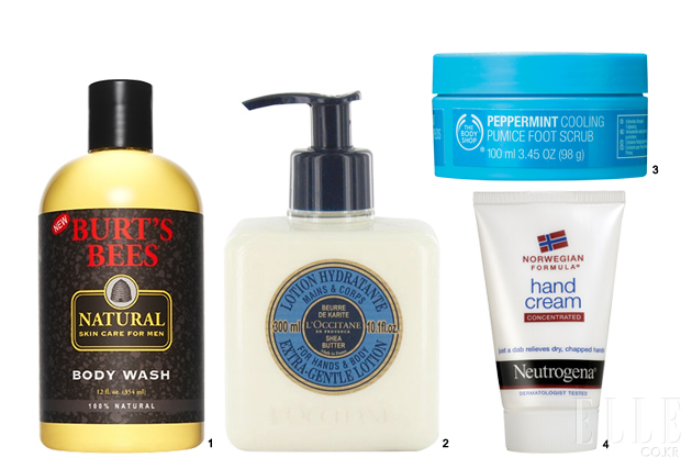 1 옥수수 전분, 해바라기 오일, 콩 단백질 등의 성분이 건조한 보디 피부에 영양과 수분을 듬뿍 공급해준다. 내추럴 케어 포 맨 보디 워시 2만7천원, 버츠비. 2 시어버터가 5% 함유되어있는 핸드 앤 바디 크림. 오트 밀크, 허니 추출물 등이 함유되어 수분 공급이 뛰어나고 펌프 타입으로 사용하기 편하다. 시어 버터 엑스트라 젠틀 핸드 앤 바디 로션 4만원, 록시땅. 3 화산암 입자의 스크럽이 발의 각질을 제거해주고 페퍼민트의 시원한 향이 발의 피로를 풀어준다. 페퍼민트 스무딩 퍼미스 풋 스크럽 1만2천원, 더바디샵. 4 향이 부담스럽지 않아 남자들도 무난히 사용하기 좋은 핸드크림. 끈적임 없이 부드럽게 스며들어 피부를 보호해 주고 보습효과도 뛰어나다. 7천원대, 뉴트로지나. | |