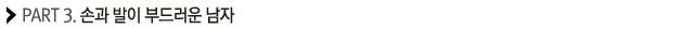 | 손이 고운 남자들에게 매력을 느끼는 여자들 정말 많다. 아무리 얼굴이 잘 생겼어도 손, 발 관리 안 하는 남자는 비호감 이라는 사실. 유난히 건조한 피부라면 보습력 높은 보디 워시를 꼭 사용하고 보디크림을 발라주는 건 필수다. 발의 경우 깨끗이 각질을 제거 해주고 풋 크림을 듬뿍 발라 양말을 신고 잠을 자도 좋다. |