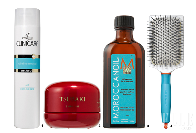 1 모발 노화와 손상을 한꺼번에 케어할 수 있는 샴푸. 리치한 텍스처로 건조한 두피까지 보호해준다. 9천9백원 해피 타임 리뉴얼 샴푸. 크리닉케어. 2 고순도 동백 오일과 윤기 센서 기능이 결합되어 갈라지고 끊어지는 현상을 치료하는 효과가 탁월한 트리트먼트. 일주일에 두 번 정도 꾸준히 사용해주면 손상된 모발을 회복시킬 수 있다. 1만7천원 츠바키 헤어 팩, 시세이도. 3 아르간 오일 성분이 유해 물질에 의해 손상된 두피와 모발을 회복시켜주며 자외선 차단 기능까지 갖춘 똑똑한 헤어 오일이다. 세련된 향이 오랫동안 지속되고 공병에 덜어 가방에 넣고 다니며 수시로 발라줘도 좋다. 6만8천원, 모로칸 오일. 4 엉킴 없이 부드러운 머릿결로 가꿔주는 브러시. 머리를 감은 뒤 부드럽게 머리를 빗어주고, 두피 전체를 꾹꾹 눌러 지압해준다. 아이오닉 세라믹 더말 브러쉬 3만원대, 모로칸 오일. | |