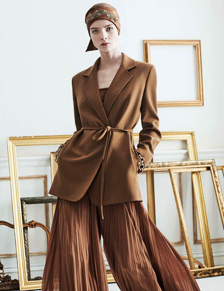 이야기를 나누고 있는 공간에는 한 번도 소개되지 않은 옷이 주렁주렁 걸려 있었다. 러시아 전통의상인 카사바로트카(Kosovorotka)에서 영감받은 셔츠에는 앤티크풍의 트리밍이 더해져 있었고, 금실로 자수를 놓은 실크가 화려한 빛을 냈다. 캐시미어와 플리세, 브로케이드로 만든 자카르 스웨터는 흰색과 검은색, 금색이 조화를 이루며 러시아의 전통 문양을 떠올리게 했다. 캐멀 컬러의 튜닉 아래로 행커치프 스타일의 밑단을 살린 스커트도 모습을 드러냈다. 이 1920년대 스타일의 의상은 ‘이리나의 순수한 영혼’이다. 자수를 놓은 밴드는 머리에 착용하거나 벨트로도 사용 가능하다. 단추를 측면에 배치한 코트는 앞섶이 벌어지지 않도록 리본을 맸고, 막스마라 하우스에서 빼놓을 수 없는 테디 코트는 슬리브리스 형태로 변신했다. 재킷 아래에는 의외로 은은한 분홍색 블라우스나 선명한 파란색을 매치했다.