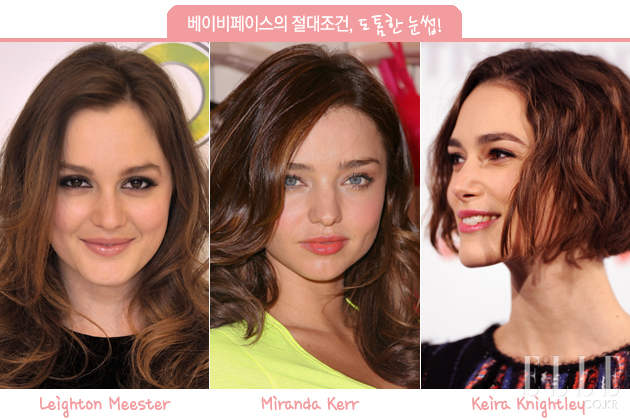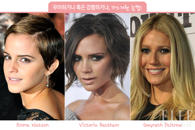 | 숱이 적어 가느다란 눈썹은 진하게 그리면 섹시하고 강렬한 인상을, 흐리게 그리면 우아하고 세련된 이미지를 연출해준다. 각지고 선이 굵은 얼굴형은 오히려 눈썹을 가늘게 그리는 것도 방법. 최근 쇼트커트를 시도해 강렬한 인상으로 변신한 엠마 왓슨은 눈썹을 얇게 그려 앳된 티를 벗었고, 빅토리아 베컴은 항상 일자의 가늘고 진한 눈썹으로 섹시한 이미지를 강조한다. 기네스 펠트로는 거의 화장을 하지 않은 듯 매번 옅은 눈썹을 고수하지만 조금 올드한 스타일로 보이는 것은 사실. |