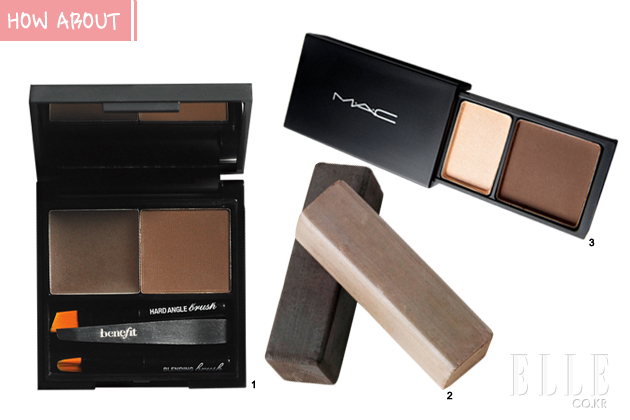 1 왁스 텍스처와 파우더 텍스처를 섞어서 사용해보자. 자연스러운 눈썹 연출과 롱래스팅 효과가 지속된다. 4만 2천원, 베네피트. 2 미세하고 시어한 펄감의 하이라이터 셰이드는 눈썹뼈 부분에 하이라이트 효과를 주어 눈매를 살려준다. 2만 7천원, 맥. 3 눈썹 사이사이를 메우기에 적합한 콘테. 눈썹을 따라 가볍게 터치한 후 내장된 스크류 브러시로 결을 정리해 준다. 2만 8천원, 루나. |